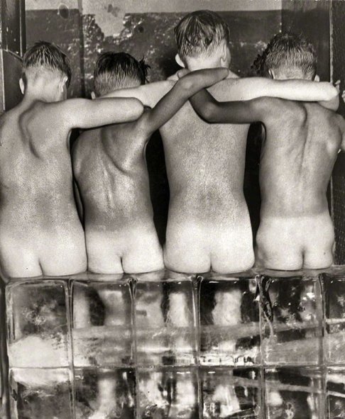 Geschichte hinter diesem Bild stecken. Warum sitzen die vier Jungen auf dem Eisblock,