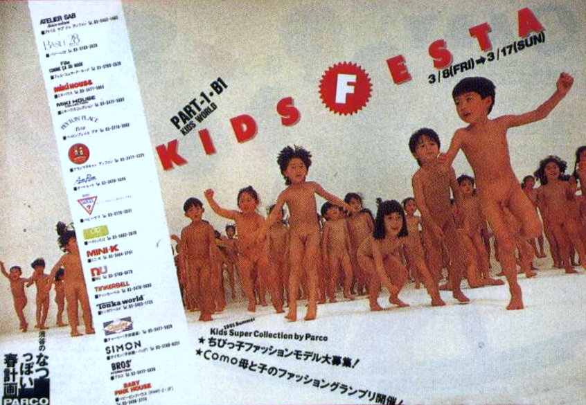 Werbeanzeige mit drei nackten Mädchen. Die Werbung soll aus dem Jahr 1974 stammen.