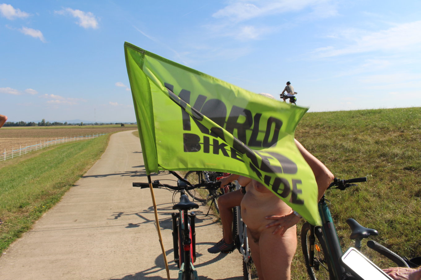 Organisiert von Get naked Germany und in Zusammenarbeit mit der „Taunus Nackt-Mountainbike-Gruppe” und dem „Naturistenbund Rhein-Main e.V.” fand am Samstag, dem 7. September, eine wundervolle Radwanderung, eine Nackt-Radtour statt. Gestartet wurde am Vereinsgelände, immer entlang des Rheins, bis zur Schwedensäule. Etwa 17 Kilometer legten die zwei Frauen und 18 Männer bei schönstem Wetter zurück. Wobei es beileibe kein Radrennen war - Gemütlichkeit war angesagt - und so brauchte die Gruppe inklusive Pausen, gut 3 Stunden für die schöne Strecke.