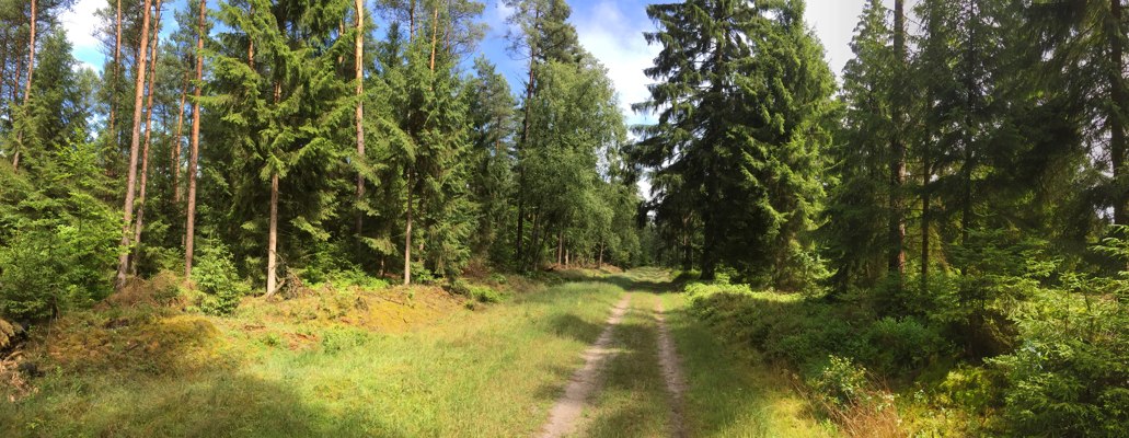 Nach ca. 2 km dann die erste Begegnung im Wald: eine einzelne textile Wanderin erwiderte den Gruß freundlich und ging ihres Weges. Nach ca. 30 Minuten wurde der Regen weniger, und zwischendurch kam sogar die Sonne raus, auch wenn sie noch nicht die Kraft hatte, Schatten zu werfen. Nach insgesamt einer Stunde Wanderzeit konnte sich die Sonne dauerhaft einen Weg durch die bis dahin dominierenden Wolken bahnen, und die Temperatur von anfänglich 14 Grad Celsius stieg in Richtung 16 Grad.