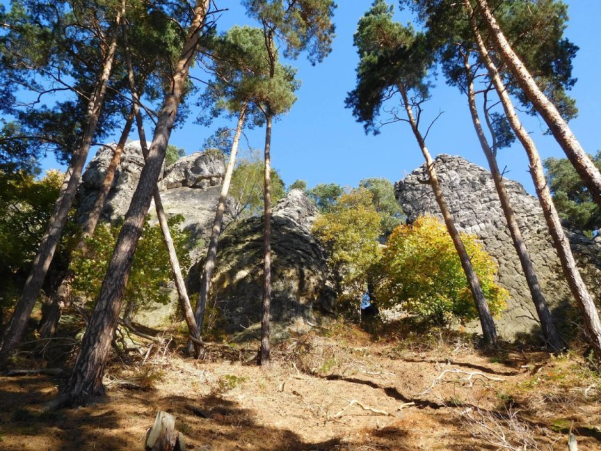 Gestartet sind Markus und ich auf dem Parkplatz vom Helsunger Krug. Von dort aus mussten wir ein ganz kurzes Stück in den Ort hinein. Aber nach ungefähr 200m waren wir dann auch schon im Wald. Dort haben wir uns erstmal leicht rechts gehalten um auf den Weg zur Teufelsmauer zu gelangen. Dort wurde der Weg zu einem schönen und schmalen Naturpfad der von durch die Sonne schimmernden Laubbäumen gesäumt war. Nach kurzer Zeit kamen wir auch schon zur „Gewittergrotte”. Das ist eine Sandsteinformation mit einem leichten Überhang über den Weg. Von da aus sind wir dem Weg weiter gefolgt bis wir schließlich am „Fuchsbau„ angekommen sind. Ein 1934 gebauter unterirdischer Aussichtspunkt mit Sitzgelegenheit.