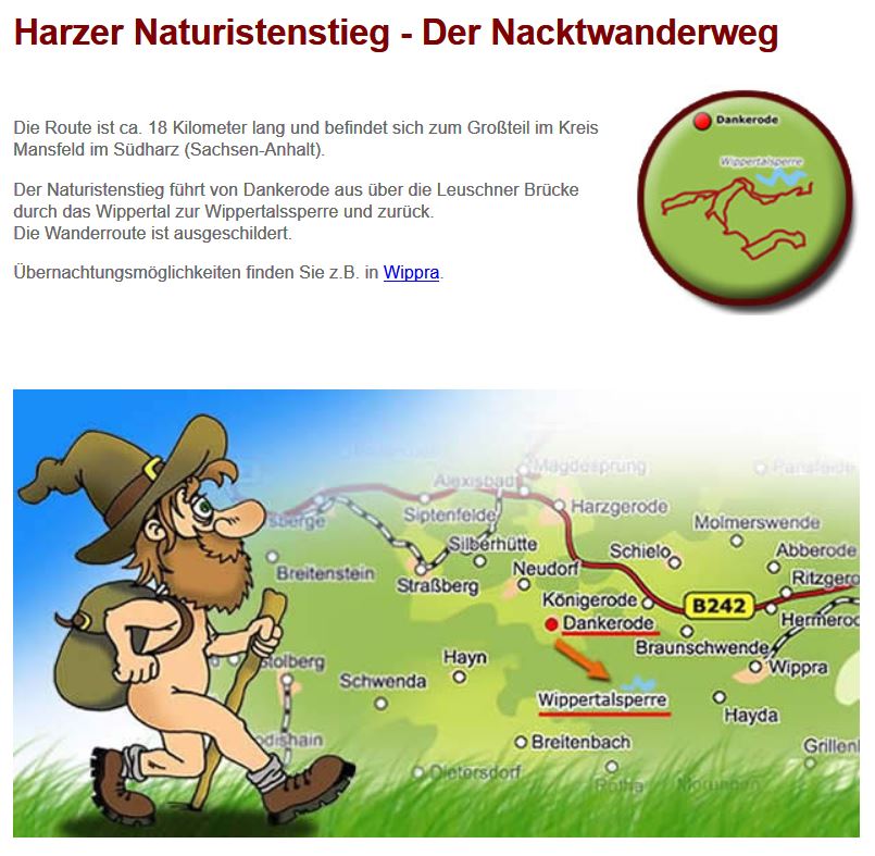 Hier am Panoroma-Campingplatz ist laut vieler anderer Quellen und Berichte i.Ü. wohl auch ein unausgeschilderter Startpunkt des offiziellen Naturistenpfades zur Talsperre Wippra, der bei vielen FKK'lern & Naturisten bereits weltweit bekannt ist (Eröffnung im Jahre 2010).