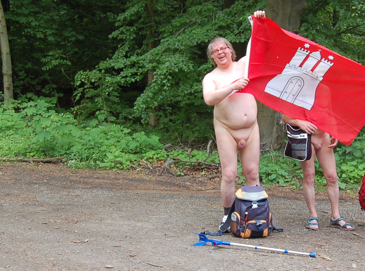 ... ich bin untrainiert und auch leicht gehbehindert - und diese beiden Faktoren forderten ihren Tribut. Wirklich schweren Herzens habe ich die Möglichkeit einer Abkürzung genutzt, nein, nutzen müssen. Bevor wir uns aber trennten, musste noch eine kleine „Foto”-Pause sein, denn als Hamburger Nacktwanderer muss man der Welt doch zeigen, dass man zumindest dabei gewesen ist.