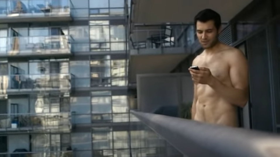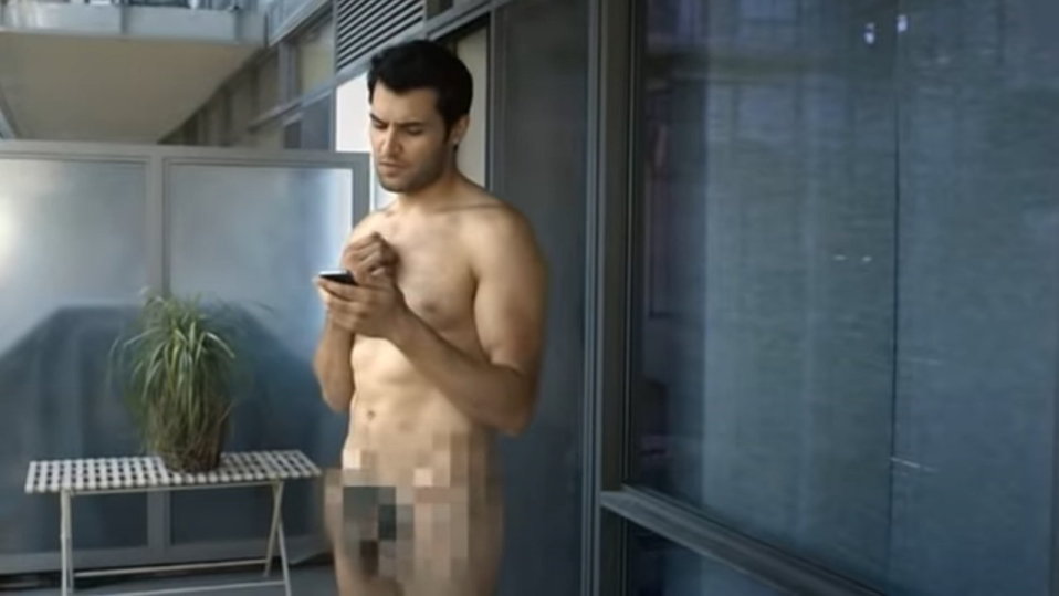 Ein Mann geht nackt auf seinen Balkon um ganz bequem von dort aus per Video-Shopping via Smartphone sich Bekleidung aus dem Gotstyle-Store zeigen zu lassen und zu bestellen.