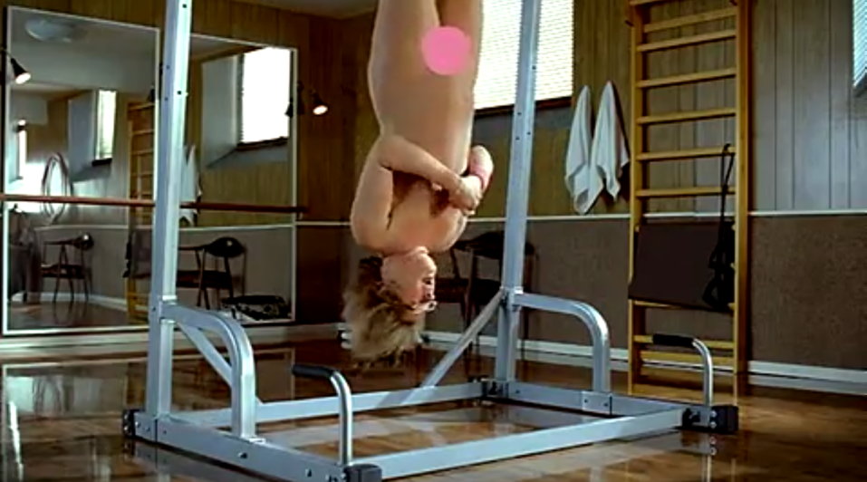 In diesem Werbespot aus den späten 1990er Jahren sieht man eine etwas ältere Dame, wie sie nackt ein paar gymnastische Übungen an einem Turngerät absolviert.