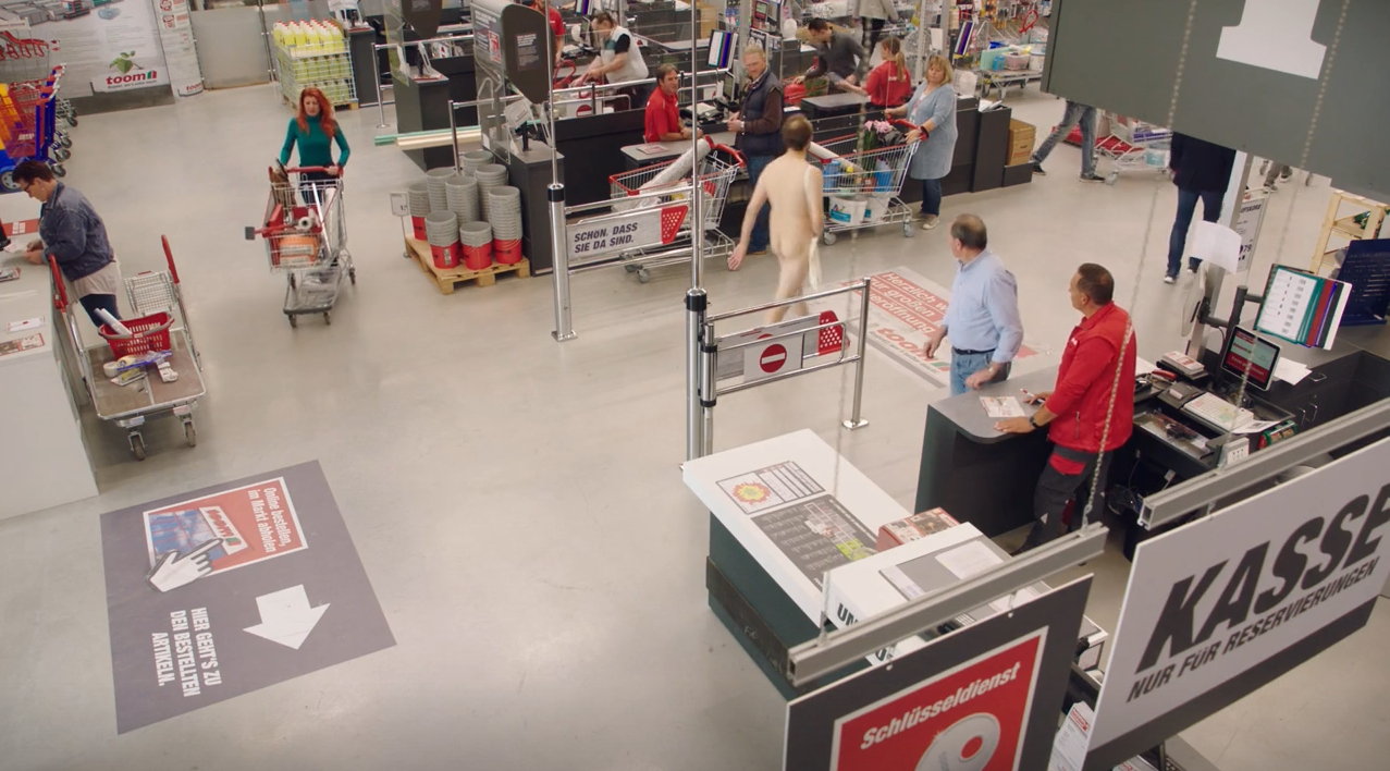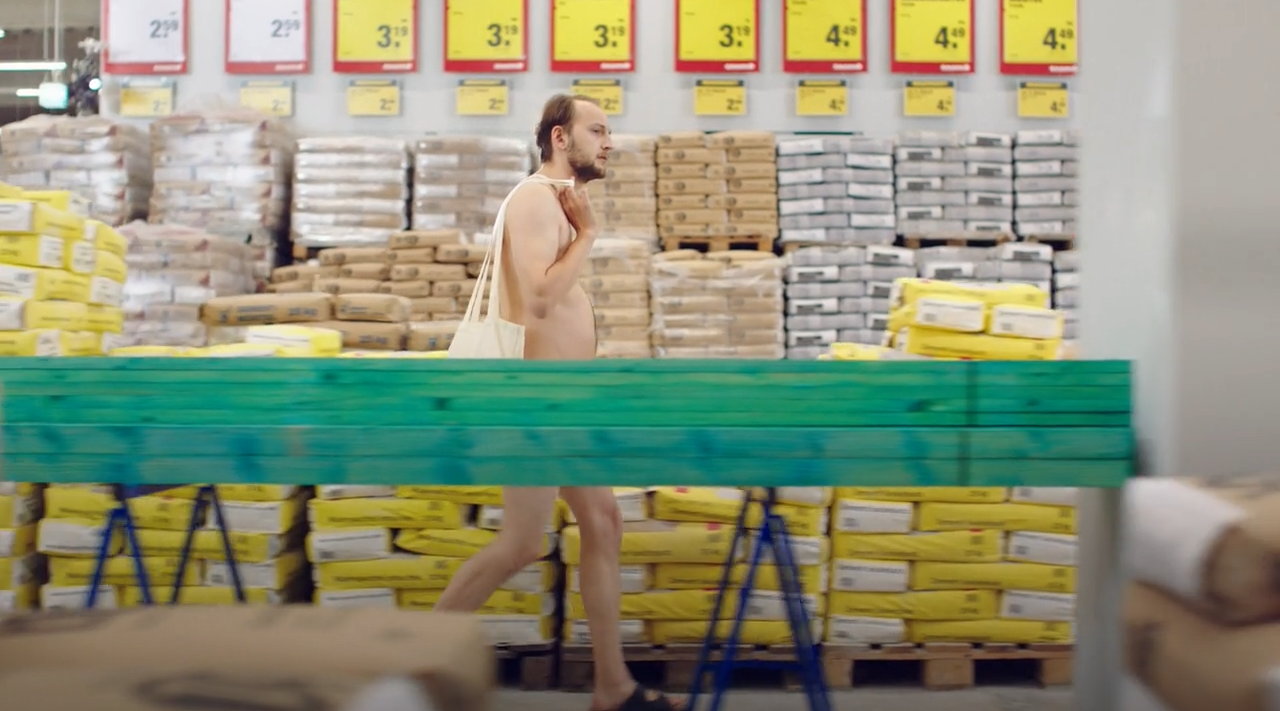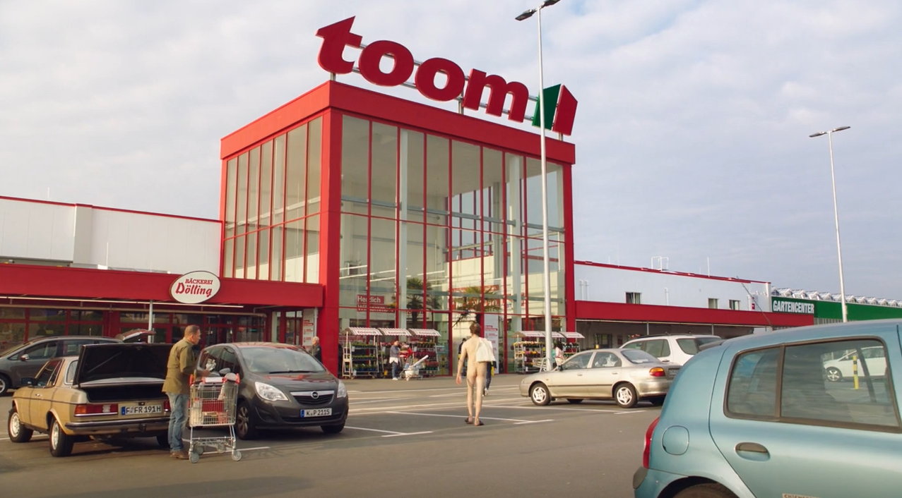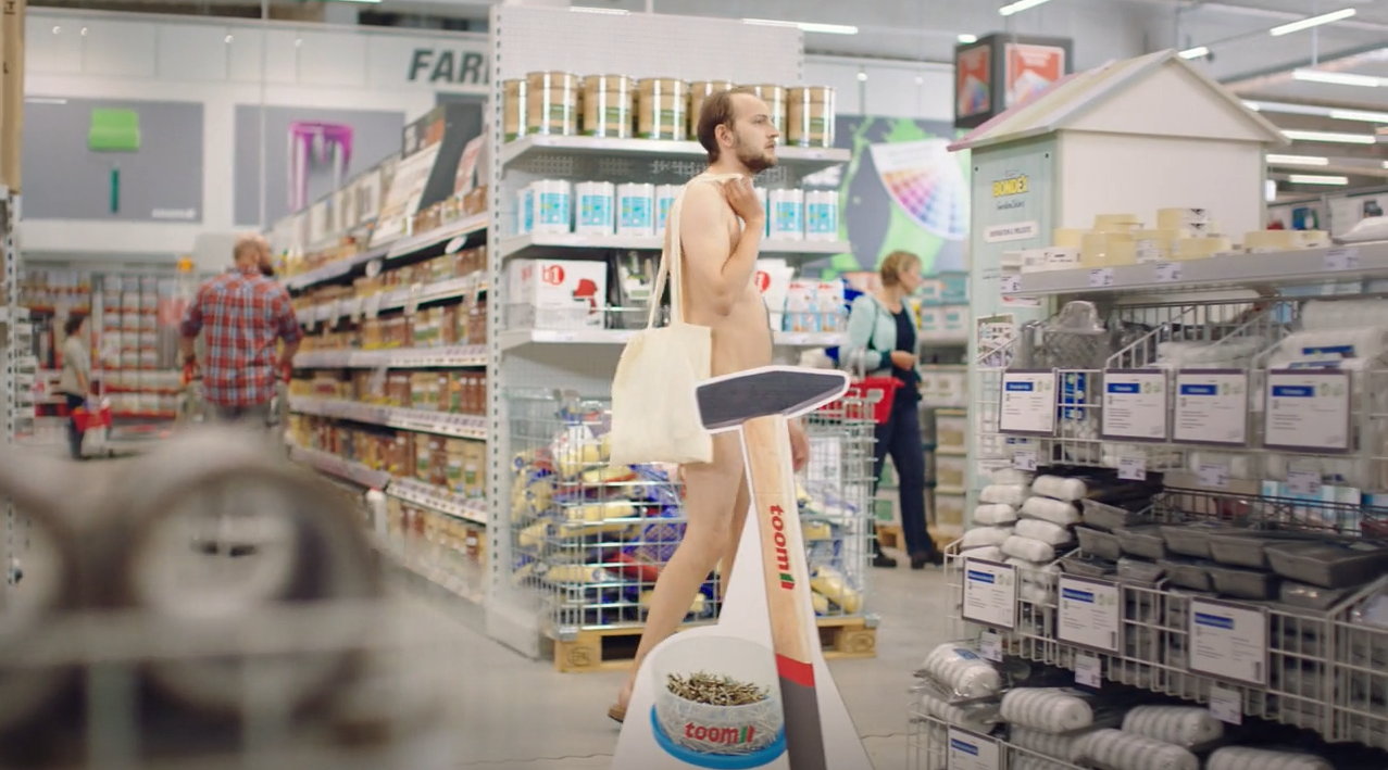 Der nackte Mann, ein Naturschützer, ist auf der Suche nach einer stabilen Kette, um sich an einen Baum zu fesseln, damit dieser nicht gefällt werden kann. Stattdessen empfiehlt ihm der Toom-Mitarbeiter umweltfreundliche, torffreie Erde, um selber Bäume pflanzen zu können.