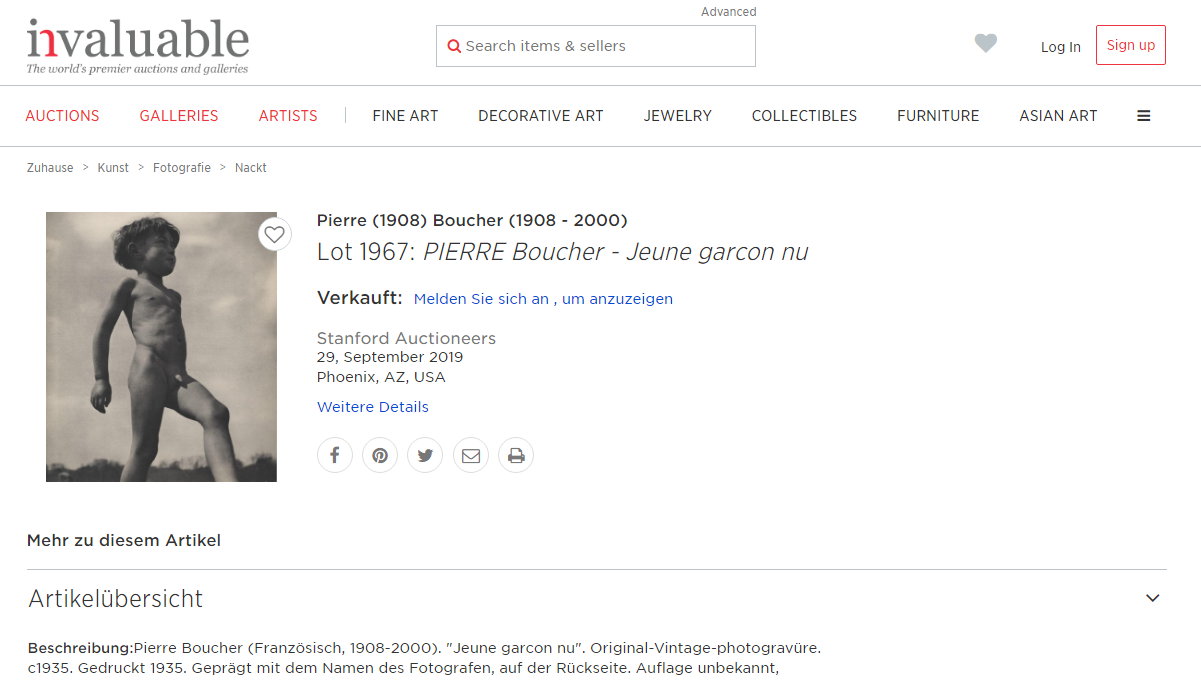 Regelmäßig findet man in Kunst-Auktion auch Fotografien (Original-Abzüge) von Pierre Boucher, welche, wie dieses Foto des nackten Jungen, Preise zwischen 300 $ und 400 $ erzielen - pro Abzug in der Bildgröße: 10 x 8 1/2 Zoll (254 x 216 mm).