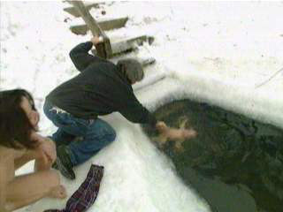 Viele Leute taufen im Eisloch auch in der Nacht, mit dem Anfang des Feiertages. Man muss mit dem Kopf ganz ins Wasser eintauchen. Diese Zeremonie erfolgt aber auch am Tag, neben der Kirche, in Anwesenheit eines Priesters. Die Badenden, bzw. die zu Taufenden sind bei dieser Zeremonie nicht immer nackt. Getauft werden nicht nur junge Leute, sondern auch alte Leute, Kinder und sogar Babies. Dieser Vorgang sieht zwar „schrecklich” aus, ist aber recht kurz und schnell vorbei.
